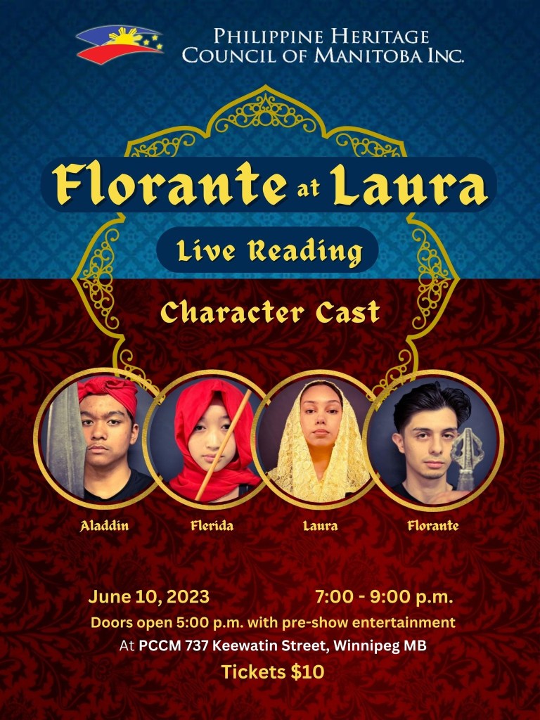 To our kababayans and Canadian friends, PHCM is pleased to feature six exciting events this June 9th to 11th. Everyone is welcome to any or all of these wonderful celebrations of Filipino heritage and culture. Special mention to the ‘Florante at Laura‘ Live Reading, a first-of-its-kind event. The event posters (click one to enlarge) are shown below, followed by their details in list form:
