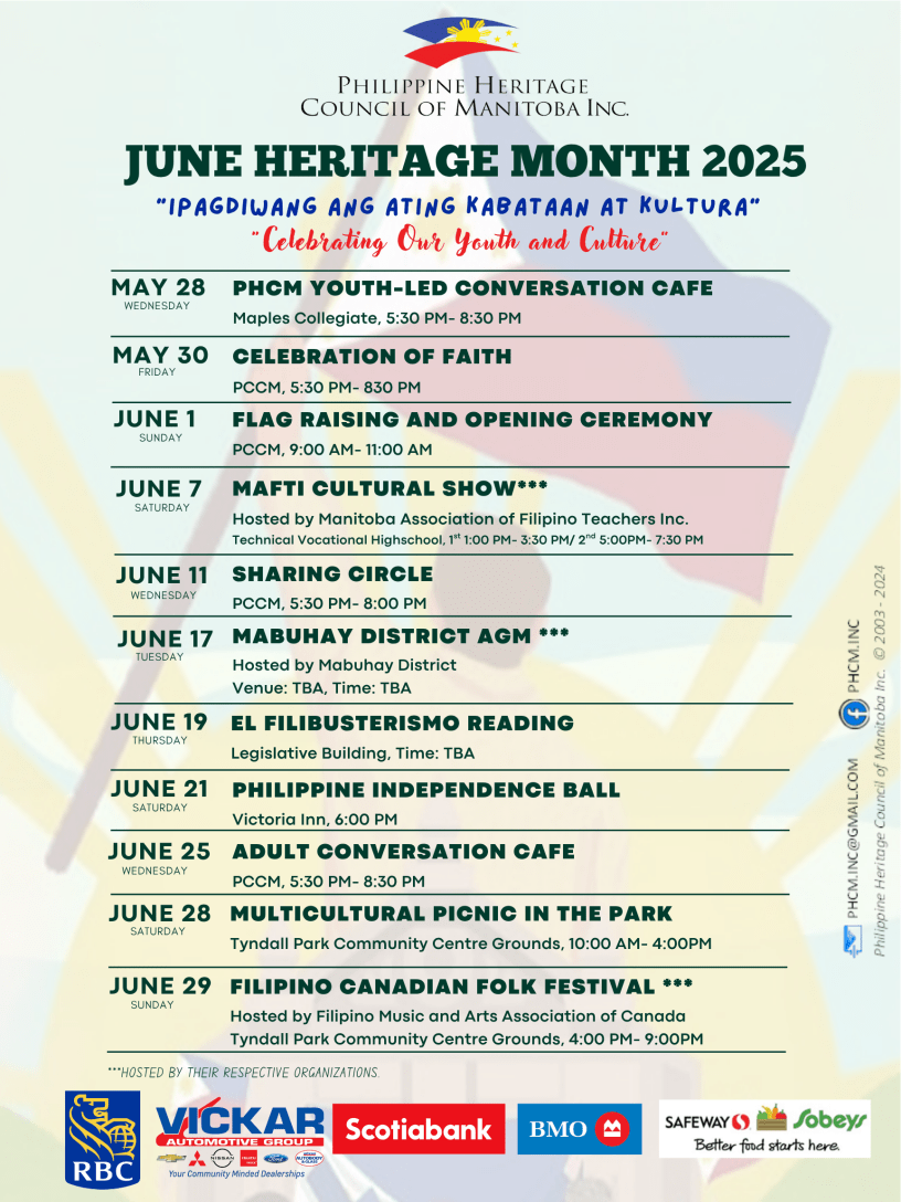 The Philippine Heritage Council of Manitoba (PHCM) warmly welcomes the community as we come together in celebration of June Heritage Month 2025. Today, we honor the spirit of resilience, unity, and positivity as we face adversity with courage and hope.